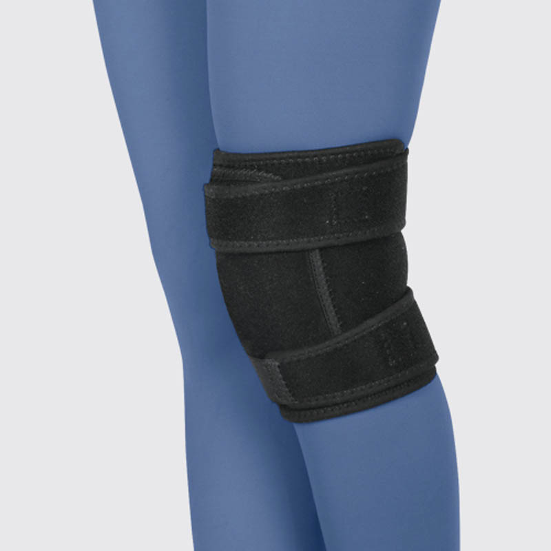 زانوبند را بهصورت کشیده بر روی زانو قرار دهید، طوری که پد محافظ رو به جلوی کشکک قرار گیرد.
